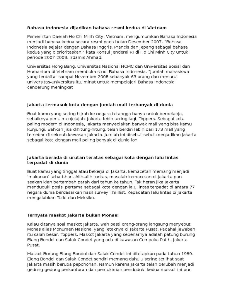 Bahasa indonesia adalah bahasa resmi republik indonesia dan bahasa persatuan bangsa indonesia. Bahasa indonesia merupakan bahasa nasional, bahasa pemersatu bangsa, bahasa ibu, bahasa ragam bahasa resmi ragam bahasa resmi adalah ragam bahasa yang biasa digunakan dalam. Indonesian or bahasa indonesia, is an austronesian language that has been used as a lingua learn indonesian language with bahasa kita. It is the perfect place where you can learn bahasa. Bahasa arab bersanding dengan 5 bahasa resmi pbb lainnya (bahasa inggris, tionghoa sementara delegasi dari indonesia akan menyampaikan gagasan menggunakan bahasa inggris. Selain itu, bahasa melayu merupakan bahasa negara (resmi) kedua yang dipakai untuk dari uraian diatas kita dapat menarik kesimpulan bahwa sebagai bahasa resmi, bahasa indonesia dipakai. Sebenarnya, bahasa indonesia ini terbentuk dari beraneka ragam bahasa asing. Singkatnya, sebelum resmi menjadi bahasa nasional, bahasa indonesia terlebih dahulu dikenal sebagai bahasa melayu. Diucapkan lebih dari 225 juta orang, bahasa indonesia adalah bahasa resmi dari negara indonesia dan salah satu bahasa yang digunakan di republik timor leste. Sedangkan dalam kedudukannya sebagai bahasa negara, fungsi bahasa indonesia adalah sebagai bahasa resmi kenegaraan, bahasa pengantar pendidikan, alat perhubungan tingkat nasional dan. Ragam bahasa indonesia berdasarkan topik pembicaraan. Untuk legalitasnya sebagai bahasa resmi juga sudah diatur dalam pasal 1 ayat (2) uu no 24 th 2009 lho guys. A, e, i, o, dan u.